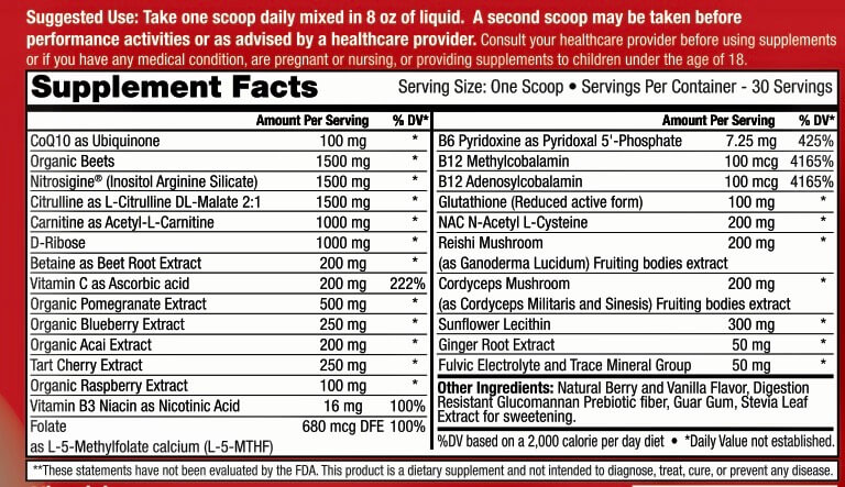 Betaine (as Beet Root Extract) – This dynamic ingredient includes studies for many potential health benefits, including the ability to enhance heart health, boost athletic performance, promote healthy insulin levels, and more.